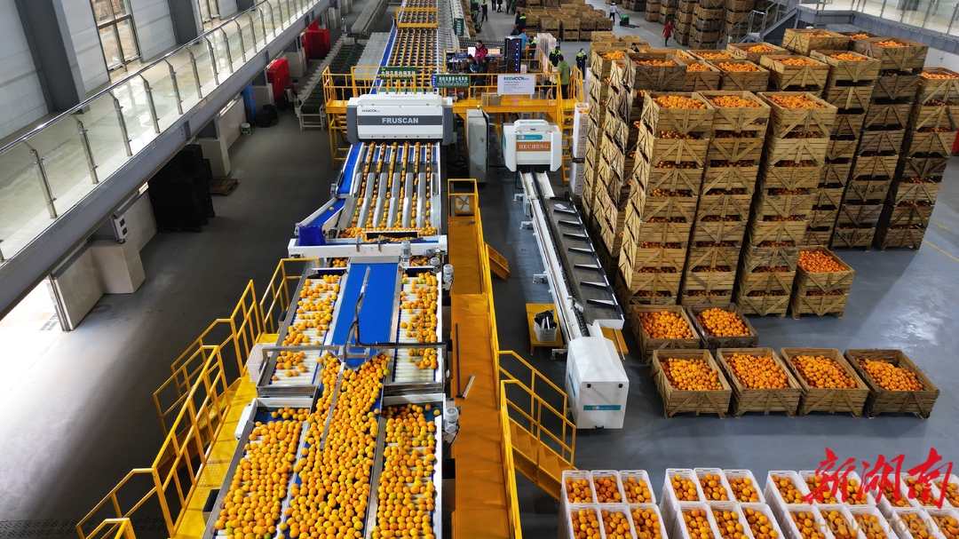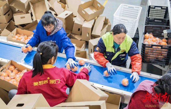 (3月13日,郴州展翔宜章脐橙产业园,工人在忙着分拣、包装脐橙。 湖南日报全媒体记者 李健 摄)