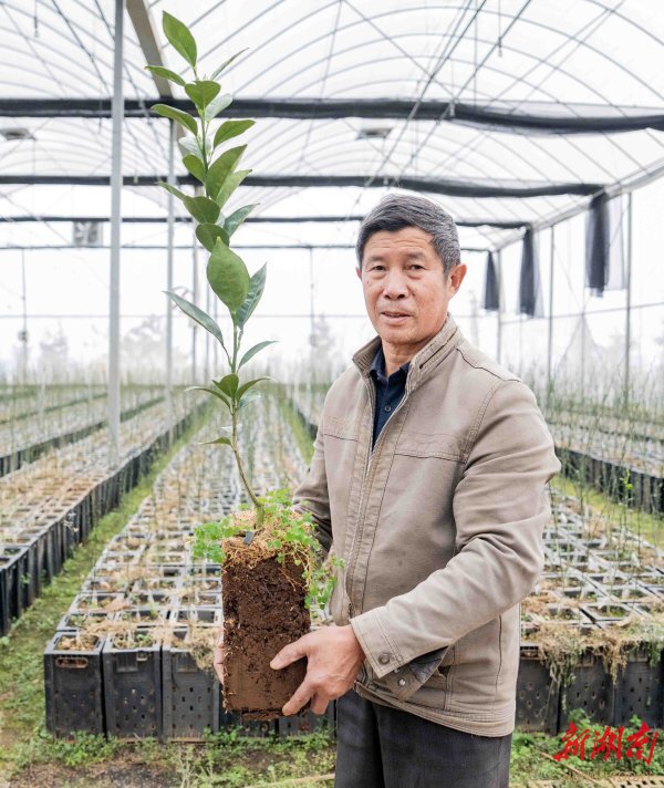 (3月13日,郴州展翔绿色农业有限公司汤家脐橙种植基地,技术人员展示自主研发的装置培育的脐橙苗木。湖南日报全媒体记者 李健 摄)