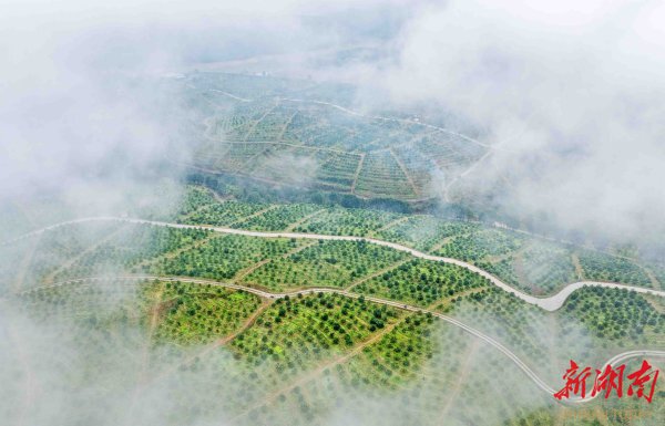 (3月14日,云雾缭绕的郴州展翔绿色农业有限公司笆篱脐橙种植基地。 湖南日报全媒体记者 李健 摄)