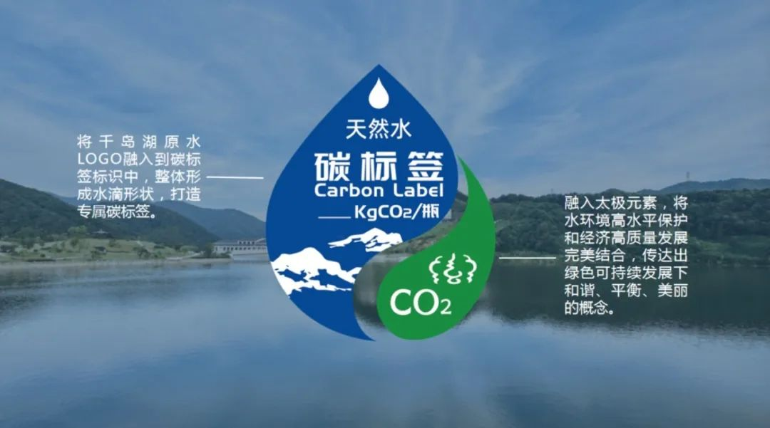 碳标签logo设计将千岛湖原水公司logo融入到碳标签标识中,并且整体打造成水滴形状,同时融入太极元素,将水环境高水平保护和经济高质量发展完美结合,传达出绿色可持续发展下和谐、平衡、美丽的概念。标签上表示的碳足迹数值,代表该产品生命周期各阶段产生的温室气体排放量,换算为CO2排放量总和。
