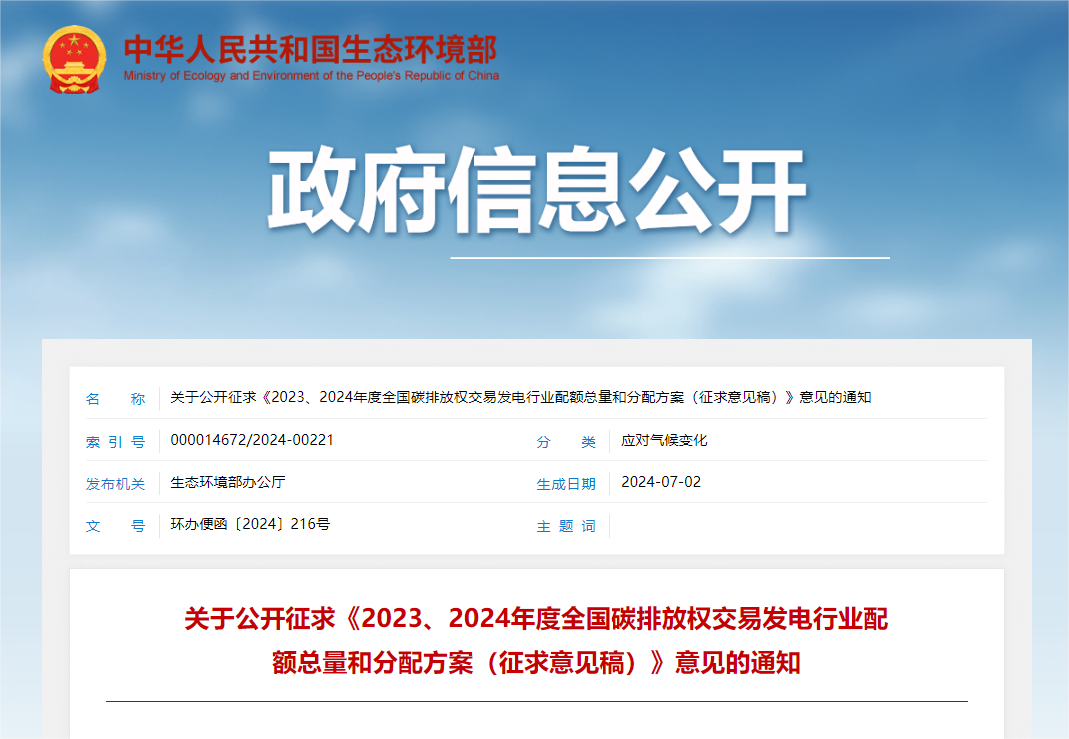 生态环境部发布《2023、2024年度全国碳排放权交易发电行业配额总量和分配方案(征求意见稿)》